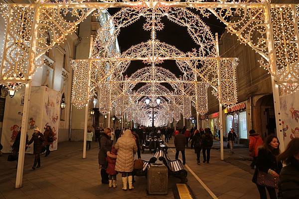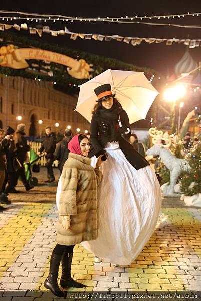 每年紅場隔壁的國家百貨公司都會設立小型的聖誕節結合新年的攤販,除了旋轉木馬、旋轉杯以外,還有個小小的舞台,每到週休二日,就有人穿著傳統服飾,開始載歌載舞,並且拉著群眾一起加入。第二年也不例外,我很喜歡這個時間跑看著他們跳著傳統舞蹈,拉著群眾一起玩著遊戲,或是讓民眾參與一起跳舞,感受一下年節的氣氛。可是在這裡生活久了,就知道每年都是這些把戲,頂多加幾個俄國童話小說的人物娛樂民眾而已。但是小小遊樂園裡還有人穿著兔子裝踩著高蹺,不斷地走來走去供人拍照,內部的工作人員也都穿著傳統服飾,年節氣氛營造得很濃厚,的確能感受俄羅斯較為傳統的文化。就我來說,今年許多地方樹立了大大的拱形門,夜晚以後由燈光點綴,然後紅場隔壁的步行街,每隔五十公尺就一個大型拱門,當時經過時聽到一個大陸口音說著:「還挺美的」。本人是翻白眼的覺得根本就像台灣廟會的燈光啊,到底是美在哪裡。